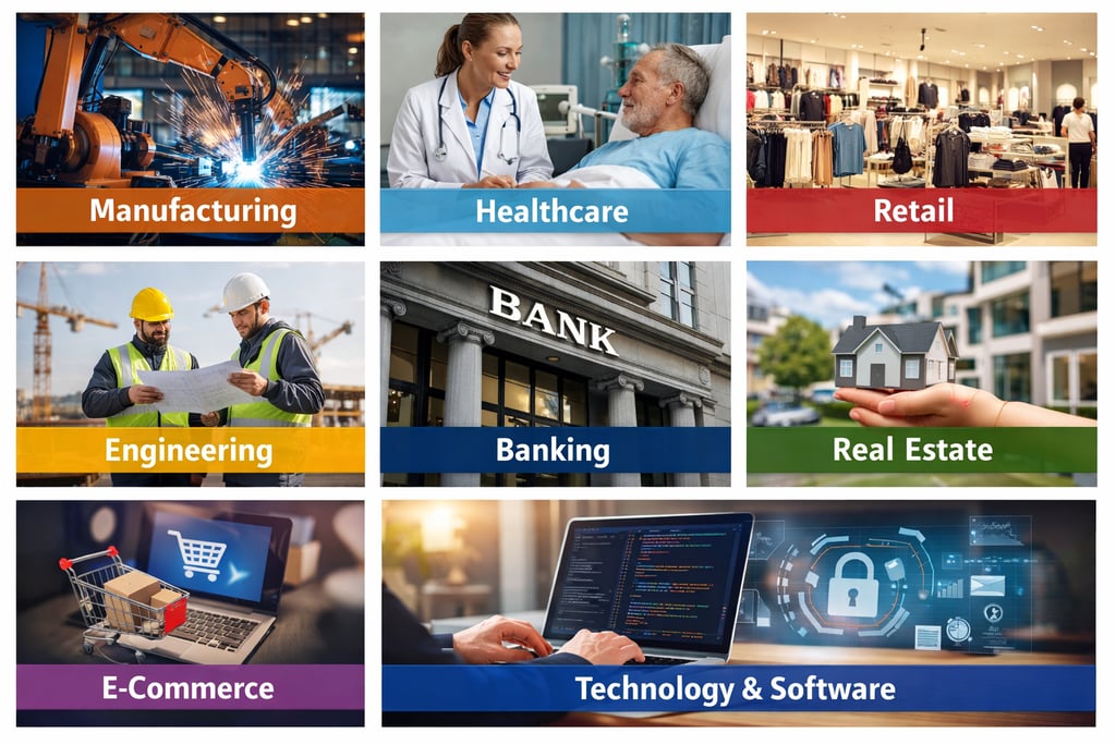 We support a wide range of industries including manufacturing, healthcare, banking, real estate, retail, e-commerce, technology, engineering, and renewable energy. Our cross-industry expertise enables us to deliver tailored finance, accounting, audit, and compliance solutions that meet sector-specific regulations, operational needs, and growth objectives across global markets.