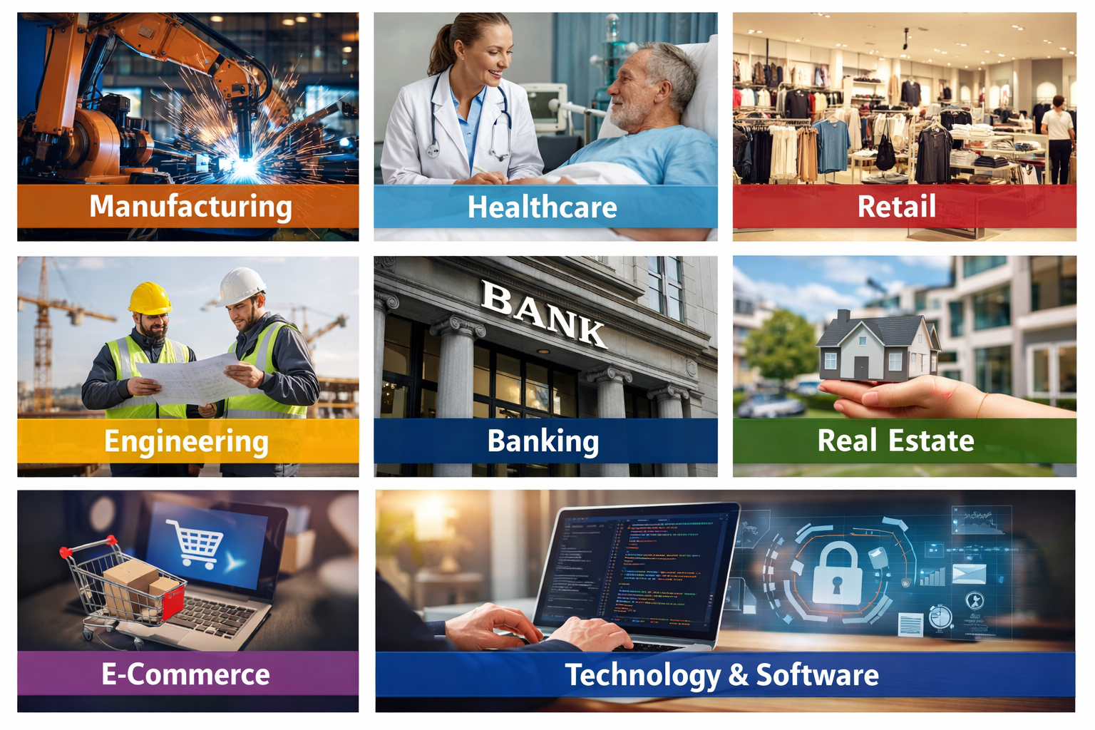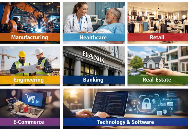 We support a wide range of industries including manufacturing, healthcare, banking, real estate, retail, e-commerce, technology, engineering, and renewable energy. Our cross-industry expertise enables us to deliver tailored finance, accounting, audit, and compliance solutions that meet sector-specific regulations, operational needs, and growth objectives across global markets.